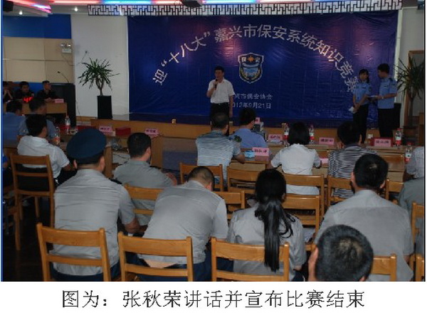 浙江省保安工作消息 為迎接黨的“十八大”順利召開(kāi),9月21日下午,浙江省嘉興市保安協(xié)會(huì)在嘉興市公安局人民警察培訓(xùn)學(xué)校舉辦了全市“保安系統(tǒng)知識(shí)競(jìng)賽”。省公安廳治安總隊(duì)保安科科長(zhǎng)、省保安協(xié)會(huì)秘書長(zhǎng)傅志方,省公安廳治安總隊(duì)保安科壽俊杰,市保安協(xié)會(huì)常務(wù)副會(huì)長(zhǎng)兼秘書長(zhǎng)張秋榮,市保安服務(wù)公司總經(jīng)理、市保安協(xié)會(huì)副會(huì)長(zhǎng)皇甫玉明等領(lǐng)導(dǎo)蒞臨現(xiàn)場(chǎng)觀摩指導(dǎo)。嘉興市公安局治安支隊(duì)政委潘新華和治安支隊(duì)副支隊(duì)長(zhǎng)朱忠華分別致了比賽開(kāi)幕詞和閉幕詞。由市局特警支隊(duì)政委陸永清等四人組成的評(píng)委團(tuán)對(duì)比賽全程進(jìn)行了監(jiān)督、評(píng)判。