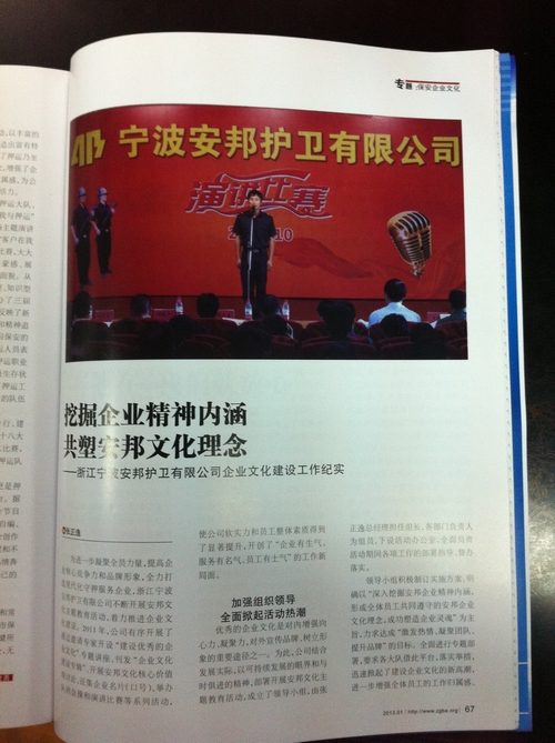 2012年,寧波安邦護(hù)衛(wèi)有限公司通過(guò)開設(shè)“建設(shè)優(yōu)秀的企業(yè)文化”專題講座、刊發(fā)“企業(yè)文化建設(shè)專輯”、組織安邦文化核心價(jià)值觀討論、征集企業(yè)名片(口號(hào))、舉辦隊(duì)列會(huì)操和演講比賽等活動(dòng),著力推進(jìn)企業(yè)文化建設(shè),顯著提升公司軟實(shí)力、核心競(jìng)爭(zhēng)力和員工整體素質(zhì),取得了一定成效。2013年1月,今年第1期《中國(guó)保安》(總第279期)雜志 “保安企業(yè)文化”專題欄目刊登《挖掘企業(yè)精神內(nèi)涵,共塑安邦文化理念——浙江寧波安邦護(hù)衛(wèi)有限公司企業(yè)文化建設(shè)工作紀(jì)實(shí)》,對(duì)寧波安邦護(hù)衛(wèi)有限公司企業(yè)文化建設(shè)情況進(jìn)行了報(bào)道,進(jìn)一步擴(kuò)大了公司的行業(yè)知名度和社會(huì)影響力。