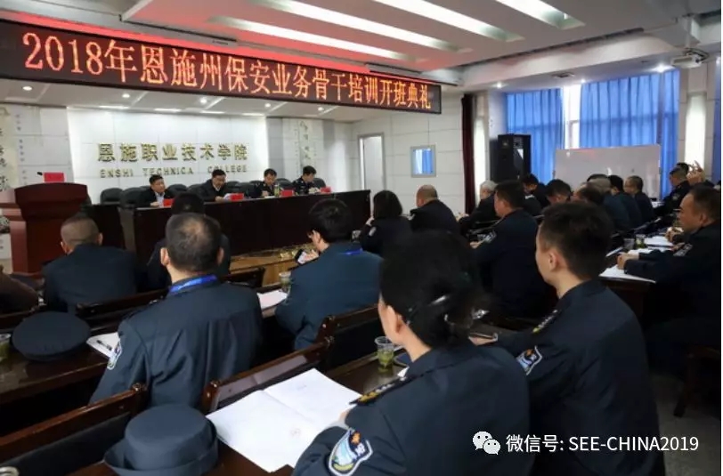 提升恩施州保安業(yè)服務(wù)水平,提高保安人員的安全意識、服務(wù)意識、業(yè)務(wù)能力,11月26日,恩施州保安業(yè)務(wù)骨干培訓(xùn)開班典禮在恩施職業(yè)技術(shù)學(xué)院舉行。恩施州人民政府副州長孔發(fā)階,恩施職業(yè)技術(shù)學(xué)院黨委書記戴清堂,湖北省公安廳內(nèi)??傟犞ш犻L肖拙出席開班典禮。