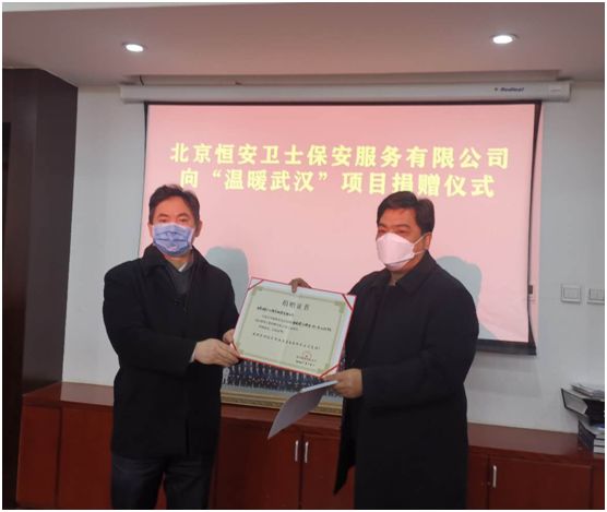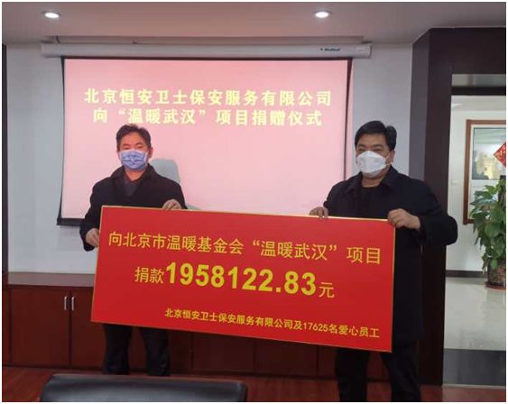 2020年3月9日,北京恒安衛(wèi)士保安服務(wù)有限公司將企業(yè)和17625名愛心員工共計1958122.83元的善款捐贈至北京市溫暖基金會,通過溫暖基金會表達(dá)對武漢市抗疫一線醫(yī)務(wù)工作者、公安干警和保安兄弟的崇高敬意。