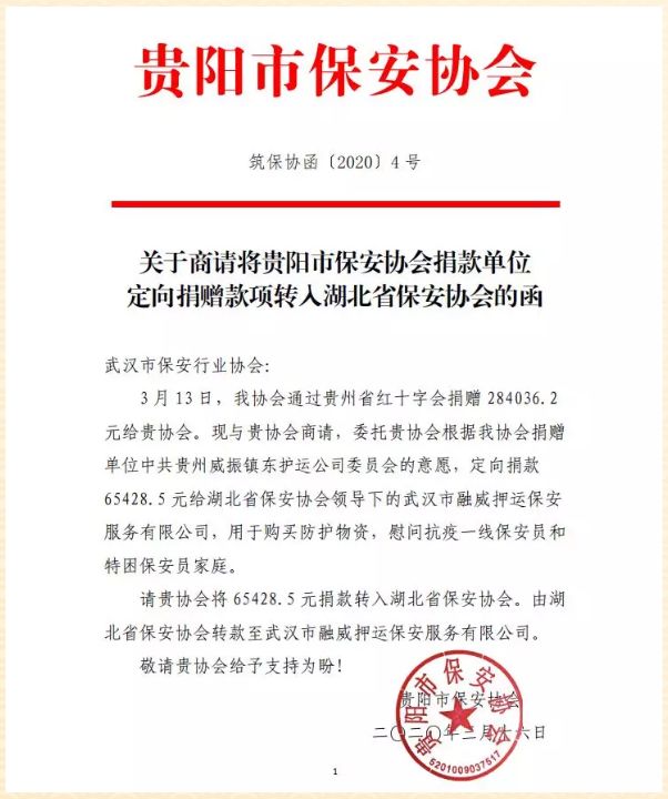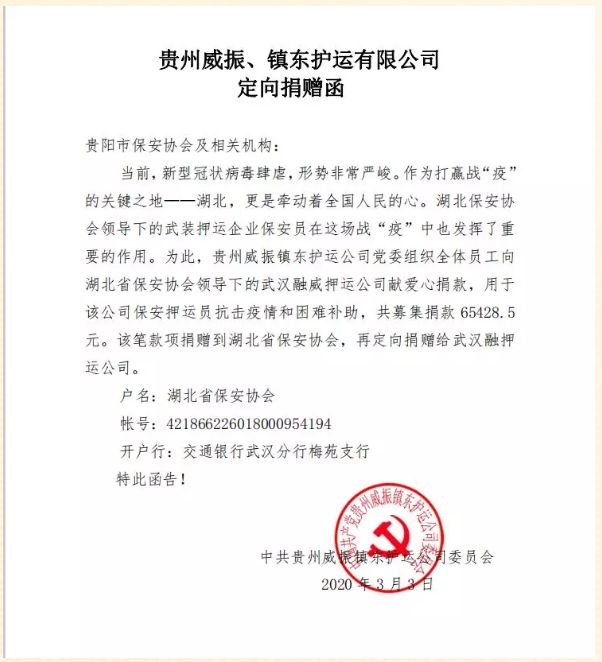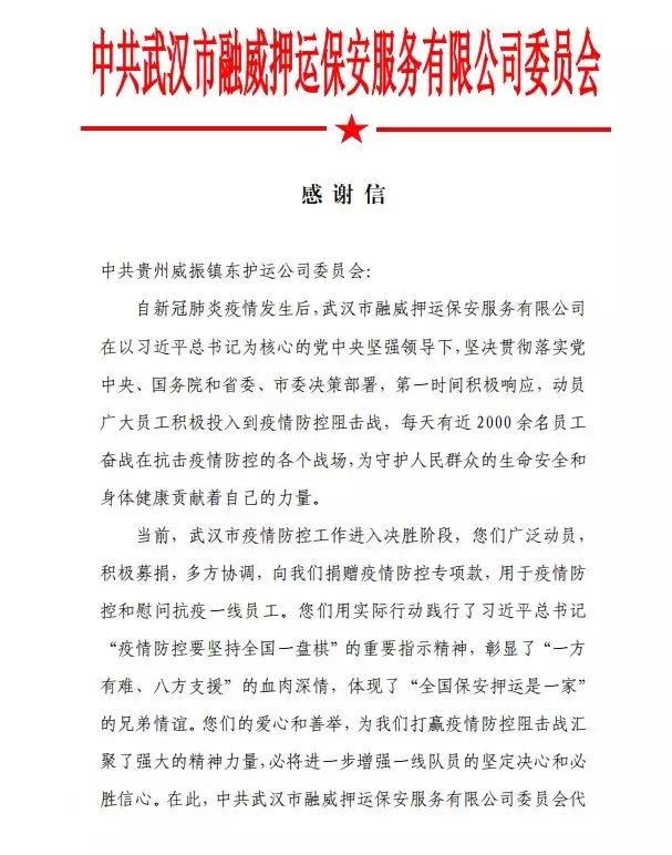 貴州威振鎮(zhèn)東護(hù)運(yùn)向武漢融威押運(yùn)捐贈(zèng)疫情防控專項(xiàng)款,用于疫情防控和慰問(wèn)抗疫一線員工