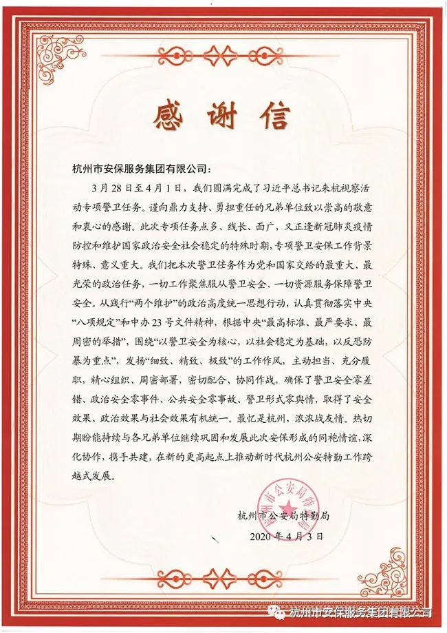 2020年3月29日至4月1日,習(xí)總書記來(lái)杭視察調(diào)研。杭州市安保服務(wù)集團(tuán)有限公司根據(jù)浙江省公安機(jī)關(guān)和特勤局要求,承擔(dān)此次重大安保任務(wù)。公司高度重視,迅速組建以公司黨委書記、董事長(zhǎng)鄭雪林為組長(zhǎng)的專項(xiàng)安保小組,在省市特勤局,屬地公安部門及相關(guān)單位的領(lǐng)導(dǎo)下,圓滿完成了習(xí)總書記在浙江調(diào)研期間的各項(xiàng)安保任務(wù)。
