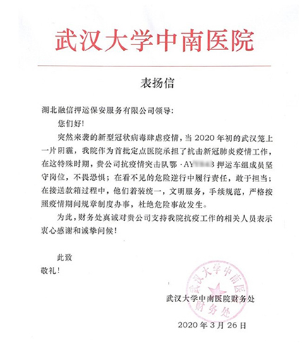 近日,廣電運(yùn)通下屬成員企業(yè)湖北融信收到了一封來自武漢大學(xué)中南醫(yī)院的表?yè)P(yáng)信,信中對(duì)湖北融信中南醫(yī)院服務(wù)車組在疫情期間堅(jiān)守崗位、不畏恐懼、敢于擔(dān)當(dāng)、文明服務(wù)的工作表現(xiàn)給予了充分肯定與表?yè)P(yáng),并對(duì)湖北融信給予醫(yī)院抗疫工作的支持與幫助表示衷心感謝。