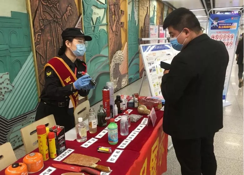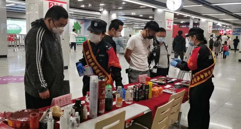 其中,宣傳展板通過圖文并茂的方式重點展示了軌道交通禁止攜帶物品目錄、安檢政策法規(guī)及地鐵安檢典型案例,在展示桌上擺放了地鐵開通以來安檢查出的違禁品,其中包括各類警用器具、管制刀具、易燃易爆、有毒有害、腐蝕性物品及其他危害公共安全的常見違禁品實物?;顒蝇F(xiàn)場還設置了咨詢臺,向乘客發(fā)放城市軌道交通條例、違禁品目錄、新冠肺炎防控等宣傳材料,并解答乘客提出的安檢相關(guān)問題。