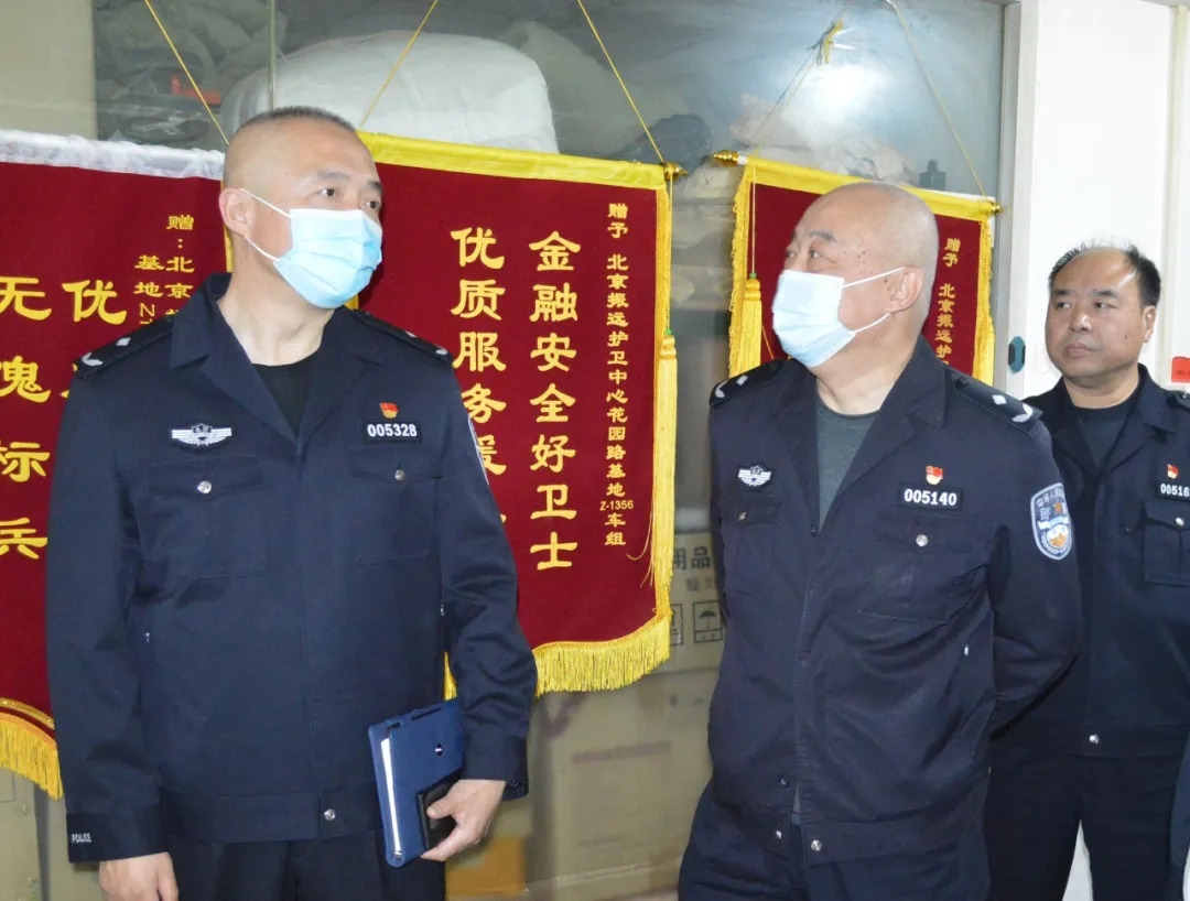 4月28日,北京市公安局內(nèi)部單位保衛(wèi)局副局長魏民在北京振遠(yuǎn)護(hù)衛(wèi)中心總經(jīng)理?xiàng)钚缕?、北京開遠(yuǎn)保安公司經(jīng)理劉伯元、文安保安公司經(jīng)理郝宗芬的陪同下,來到振遠(yuǎn)第十二支隊花園路基地檢查指導(dǎo)疫情防控工作,并看望慰問基地一線押運(yùn)隊員。